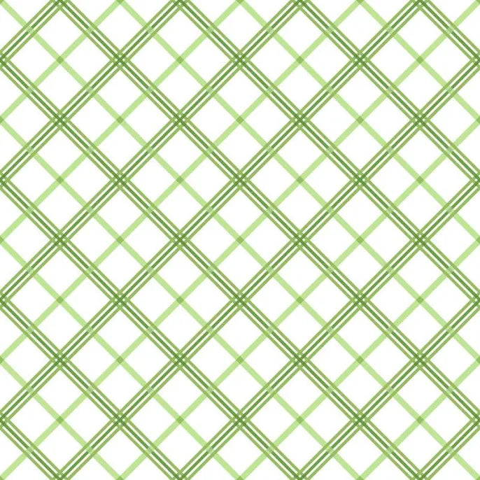Kimberbell Basics Refreshed is a collection by Kim Christopherson for Maywood Studio. This white fabric features a diagonal green plaid in three different shades.