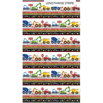 Stripes of multicolored trucks, tools, bricks, and caution tape, on a white background. Little builders will dig these fabrics! Build Your Own World from Northcott is filled with excavators, bulldozers, and cement trucks, as well as hand tools and fun construction-related prints. If you want to construct a quilt that will be a little one’s favorite, you’ll nail it with this collection!