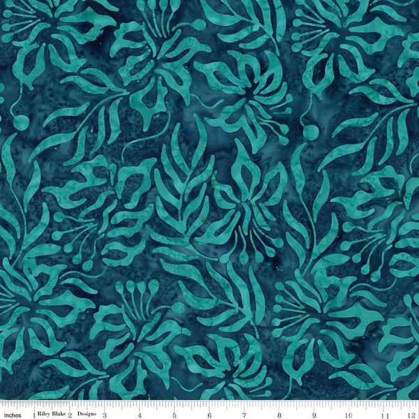 This vibrant fabric features a captivating batik design with a dark blue background, adorned with stylized floral motifs in shades of teal and turquoise. The intricate patterns of leaves and flowers create a dynamic and eye-catching look, perfect for adding a touch of exotic elegance to any project. The fabric's rich color palette and unique design make it ideal for quilting, apparel, or home decor, offering both durability and aesthetic appeal.