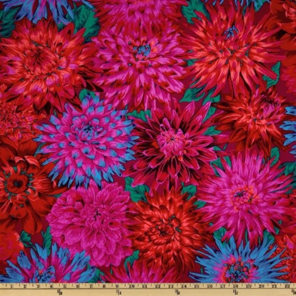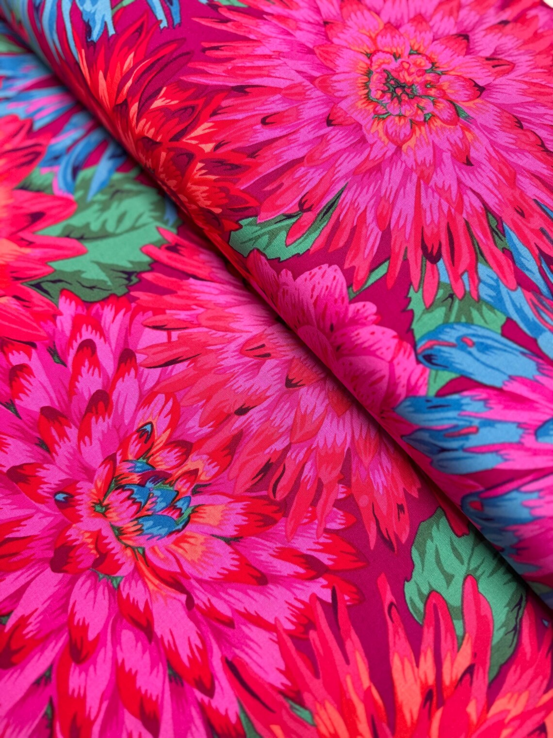 This gorgeous fabric was designed by Philip Jacobs, lending his distinctive style to the Kaffe Fassett Collective. With vibrant pink, orange, blue, and red dahlias and vivid teal leaves over a bright fuchsia background, this fabric is sure to be the statement piece for your next project.