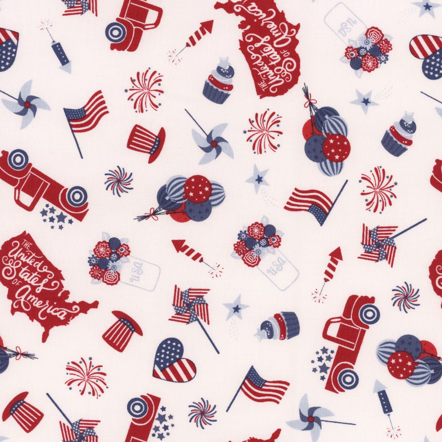 Get ready for summer with the Stars and Stripes Forever quilting fabric collection by Lori Whitlock for Riley Blake Designs! This fun white fabric with tossed patriotic motifs like pinwheels, American flags, fireworks, and trucks is perfect for your next summer project!