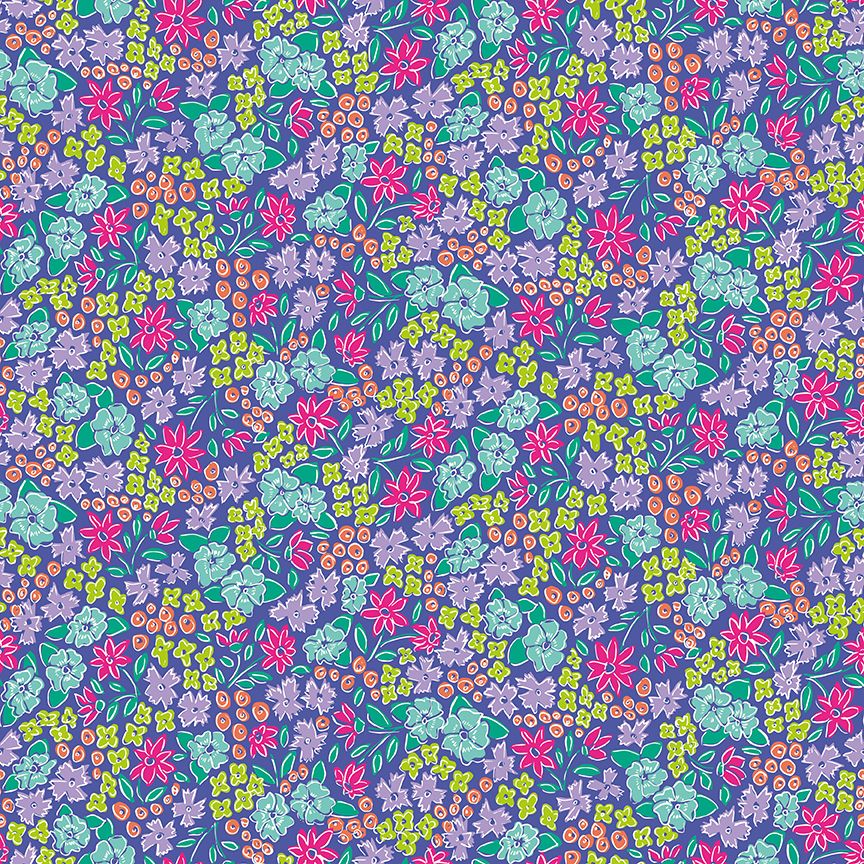 Introducing the Vibrance Main Periwinkle fabric, a stunning creation by Leslie Ryan of Blooming Boldly Designs for Riley Blake Designs. This fabric is a vibrant tapestry of small florals and unique geometrics in an enchanting palette of blue, pink, green, purple, and periwinkle. Perfect for quilting, crafting, or adding a pop of color to any sewing project, this fabric is designed to inspire creativity and joy. The lively pattern dances across the fabric, making it ideal for those who love bold, eye-catching designs.