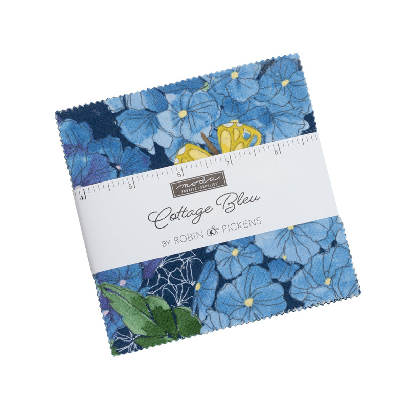 These quaint fabrics by Robin Pickens for Moda Fabrics feature dainty florals and butterflies in sunny pastels and deep blue hues. This 100% cotton charm pack includes 42 - 5 inch squares from the Cottage Bleu line.