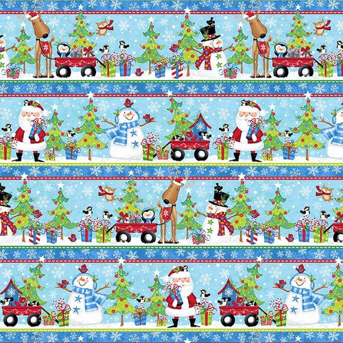 A Jolly Good Time is to be had with this collection. Snow falls down through the pale blue winter skies. Penguins stay warm while waddling in their scarves. Owls hoot with delight that it is almost Christmas time. Santa is nearby with gifts for all as his reindeer prepare for a cold flight in the night. Gather your hat and scarf to stay warm as you quilt with A Jolly Good Time.