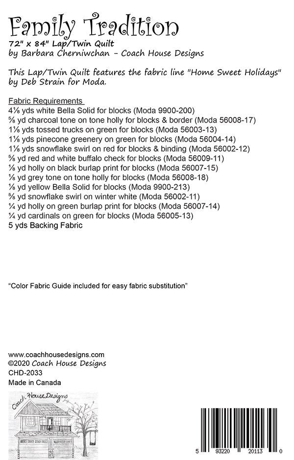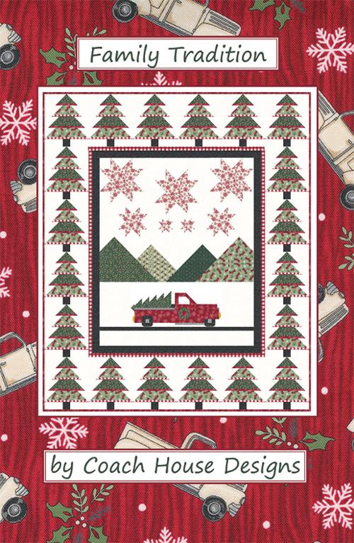 72" x 84" Large Lap/Twin Quilt with a pieced red truck, driving through the mountains, under the stars and surrounded by decorated Christmas Trees. This pattern is all piecing.