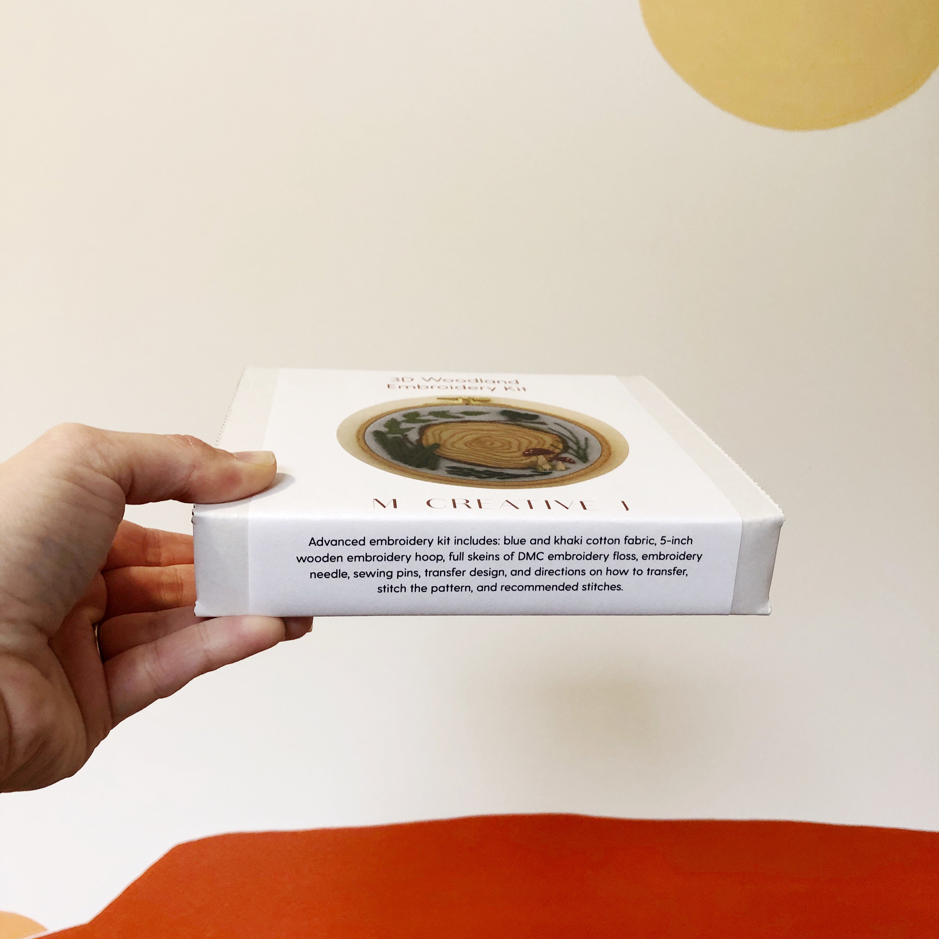 Have you been interested in three dimensional embroidery? Want to try creating a variety of stitches that pop off the fabric? Then the 3D Woodland embroidery kit is perfect for you! This design features an applique wood trunk and 3D greenery. Even if you haven't tried 3D embroidery before, this kit makes it approachable and fun. With this design you'll learn to use the split back stitch, reverse chain stitch, padded satin stitch, pistol stitch, colonial knot, stem stitch, detached chain stitch, couching, woven picot stitch, bullion knot, cast on stitch, and needle weaving bar.