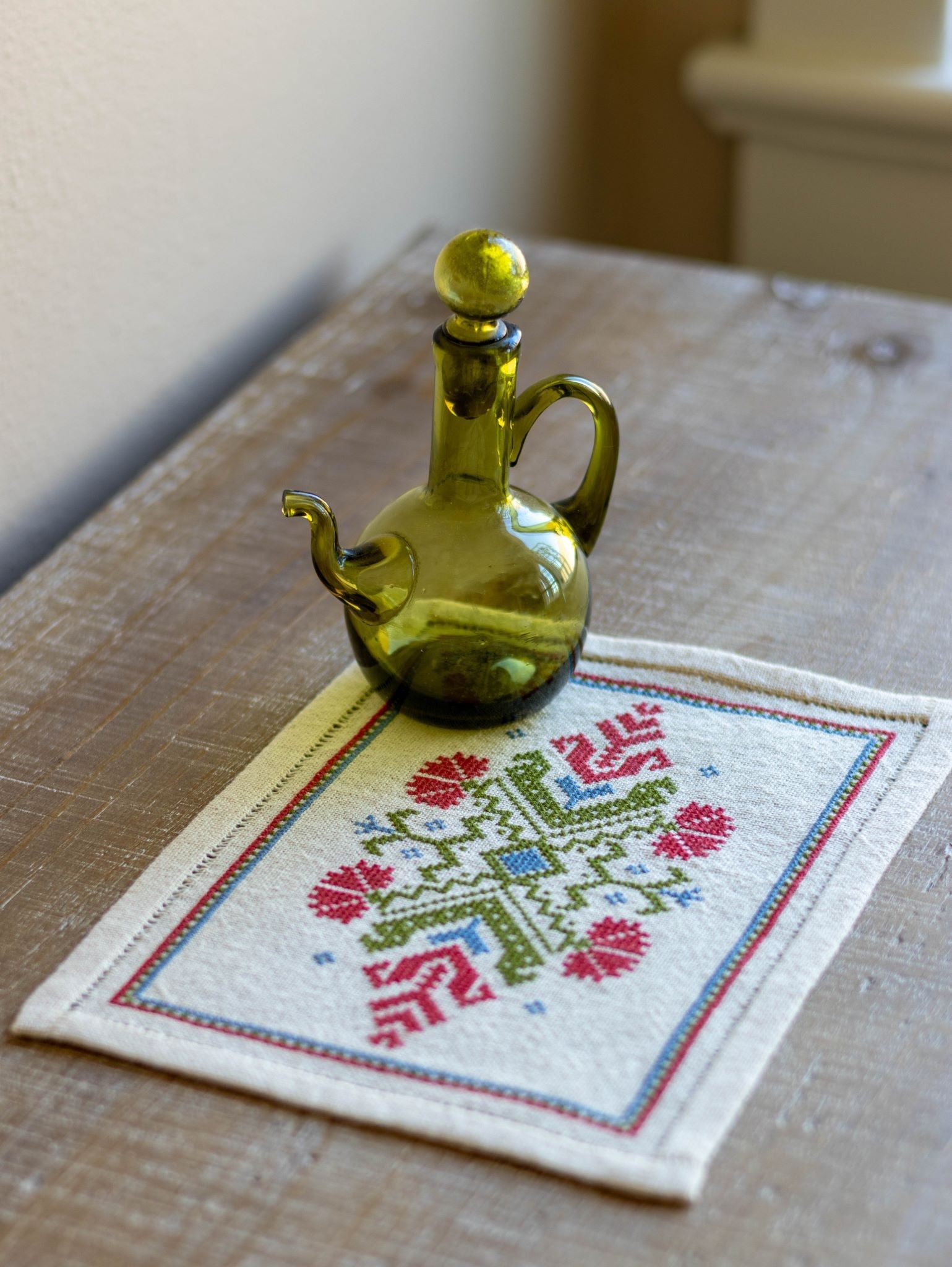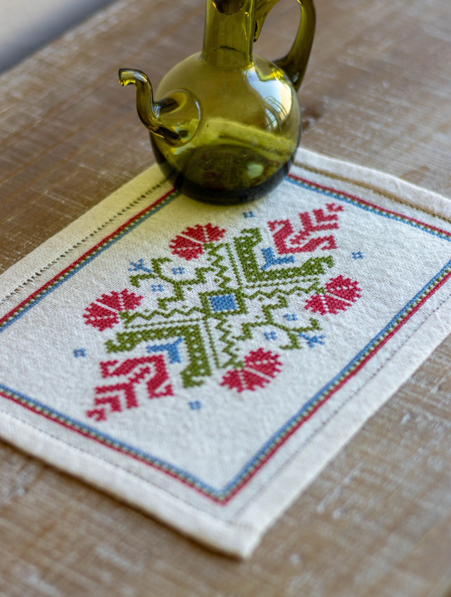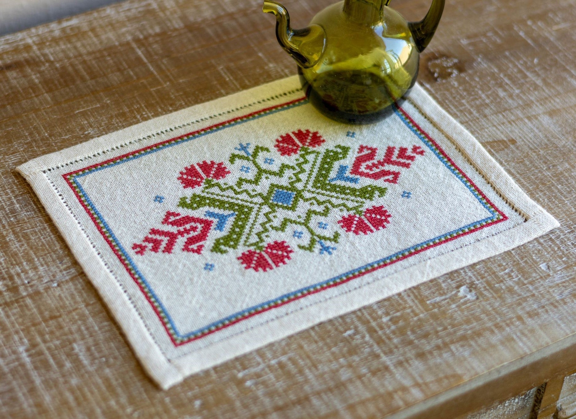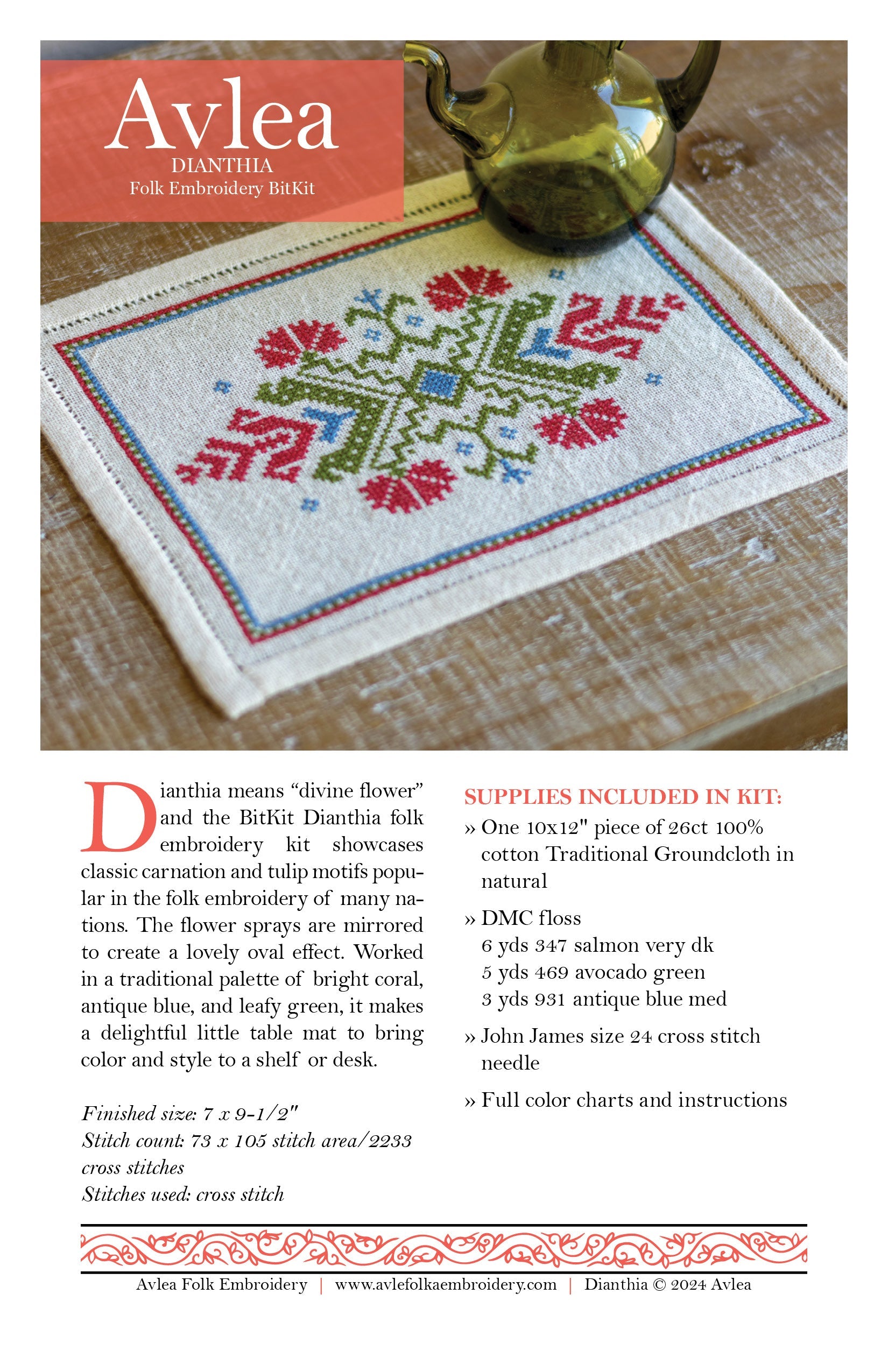Dianthia means “divine flower” and the BitKit Dianthia folk embroidery kit showcases classic carnation and tulip motifs popular in the folk embroidery of many nations. The flower sprays are mirrored to create a lovely oval effect. Worked in a traditional palette of bright coral, antique blue, and leafy green, it makes a delightful little table mat to bring color and style to a shelf or desk. Kit includes: 26ct 100% cotton Traditional Groundcloth in natural, DMC 100% cotton embroidery floss, John James size 24 needle, full color charts and instructions.