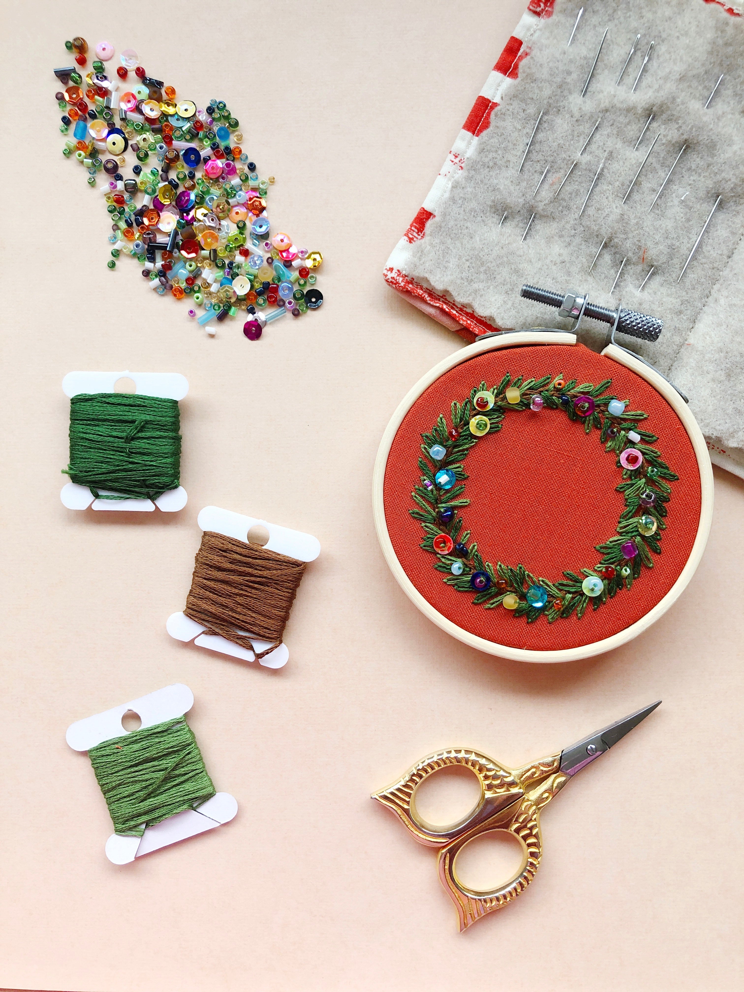 Add some sparkle to your ornaments this year! Trim your tree with a bedazzled holiday wreath ornament. Learn how to embroider a beginner-friendly wreath, then make it your own with beads and sequins. This botanical embroidery kit is the perfect project to create a custom ornament for the holidays in under a few hours.