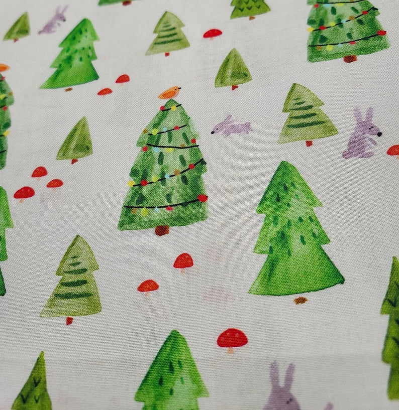 The "A Swell Noel - FLSNK-D100-LY - Holiday Forest" fabric, from designer Freckle + Lollie (a Kathy Davis Studio), and Twin Orchards Textiles is made from 100% cotton. It's a quilting-weight fabric suitable for various projects like crafts and fashion, and it's machine washable. With a design of rabbits who frolic amid green Christmas trees on a light background