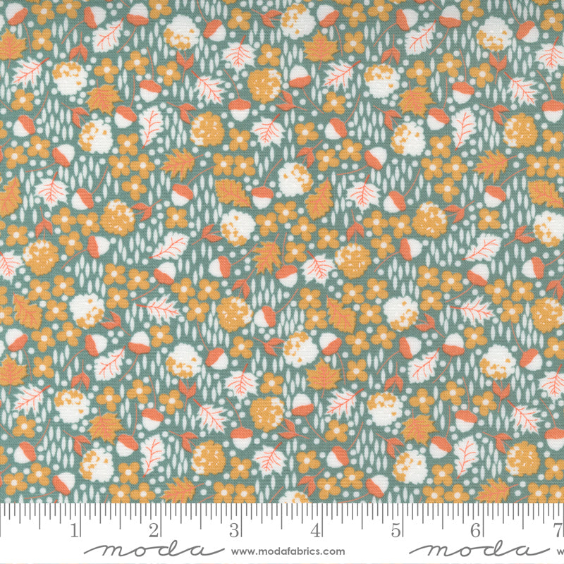 Cozy Up by Corey Yoder from Moda features flowers, gingham, words, berries, acorns and pin dot in shades of cloud, cinnamon, grey skies, blue skies, sunshine, moss, and more.