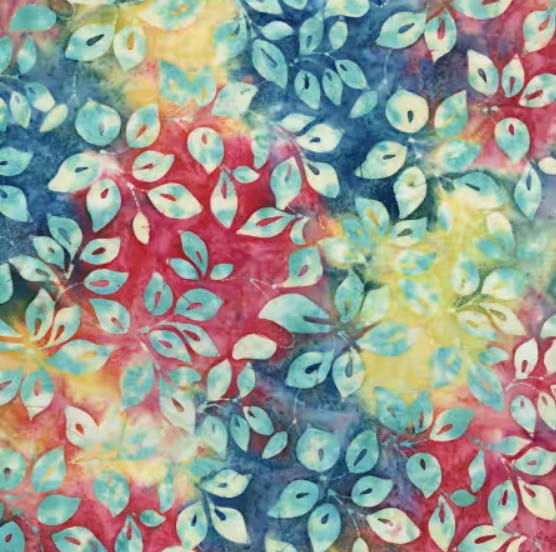 This vibrant batik fabric features a stunning array of overlapping leaves in shades of blue, red, yellow, and green, creating a dynamic and colorful pattern that evokes the brilliance of carnival glass. The design is intricately detailed, with each leaf outlined in white, adding depth and contrast against the rich, multicolored background. Ideal for quilting, apparel, or home decor projects, this fabric brings a touch of artistic flair to any creation.