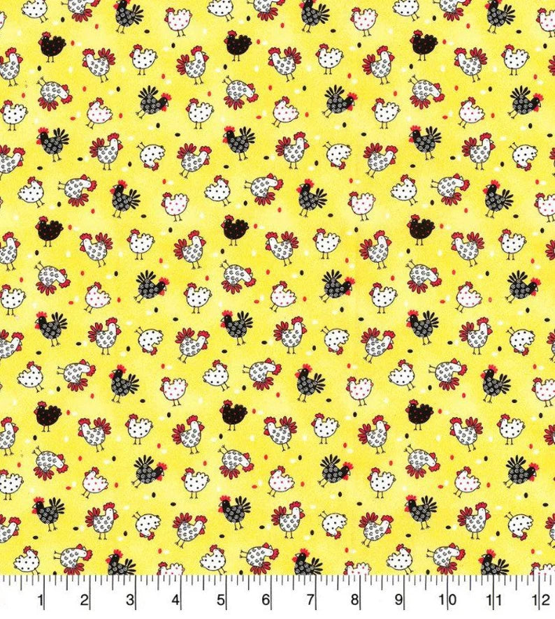 Add a touch of charm to your projects with this cotton print fabric featuring whimsical mini chickens in white black and red on cheerful hues of yellow,
