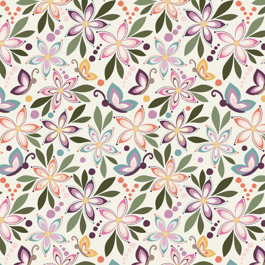 Juju's Petals by Judi Madsen for Riley Blake Designs is great for quilting, apparel and home decor. This print features blossoms, leaves, butterflies, and dots.