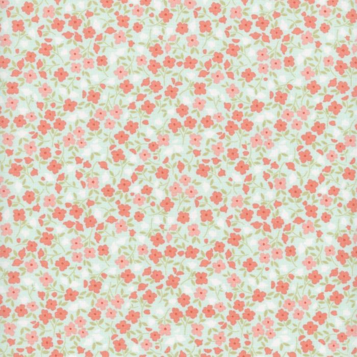 Sunbonnet by Heather Briggs of My Sew Quilty Life for Moda Fabrics is a sweet and nostalgic quilting fabric collection that evokes a sense of timeless charm. This aqua fabric featuring packed pink and coral florals would make a beautiful quilt backing or background fabric in your next project.
