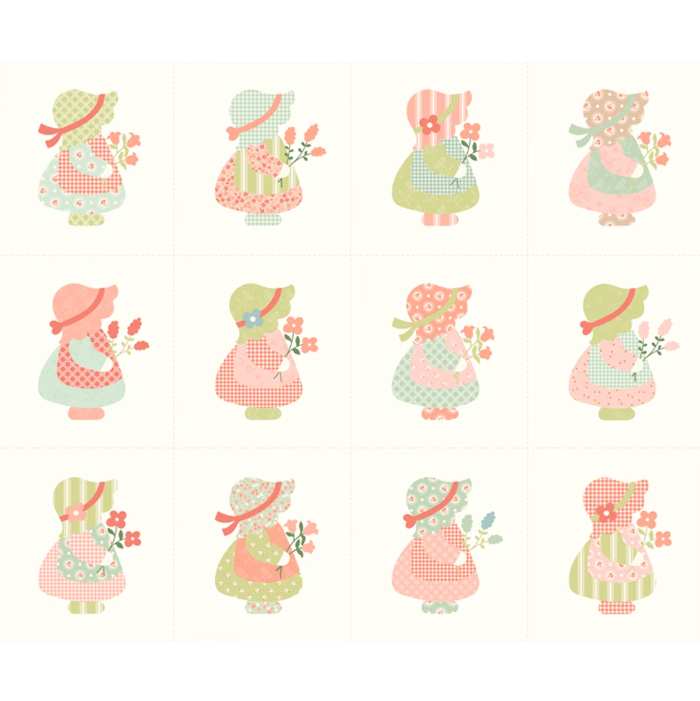 Sunbonnet by Heather Briggs of My Sew Quilty Life for Moda Fabrics is a sweet and nostalgic quilting fabric collection that evokes a sense of timeless charm. This cream panel features 12 whimsical sunbonnet girls holding flowers in varying colors and patterns. This panel measures approximately 36" x 44".