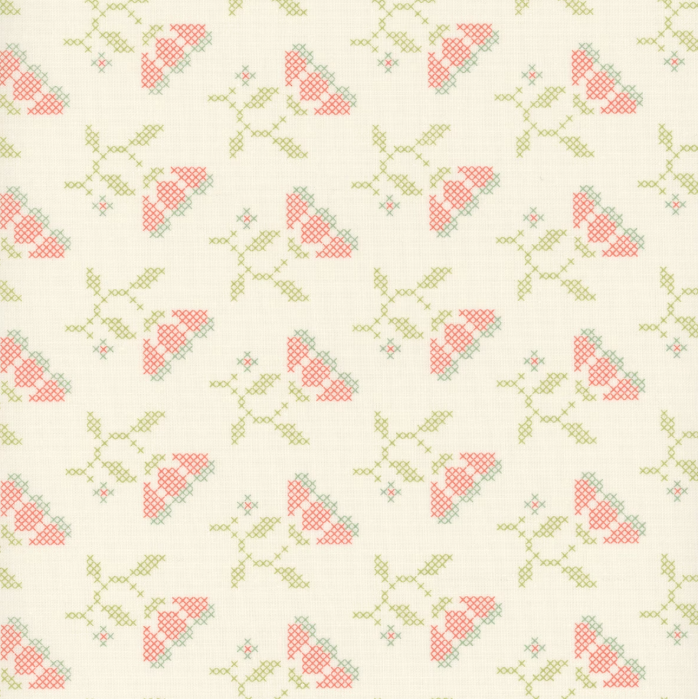 Sunbonnet by Heather Briggs of My Sew Quilty Life for Moda Fabrics is a sweet and nostalgic quilting fabric collection that evokes a sense of timeless charm. Add stunning texture to your projects with this cream fabric featuring a floral cross-stitch print.